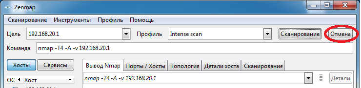 Снова запустим Zenmap на виртуальной машине симулируя атаку. Заметим что сканирование больше не идет. Закончим сканирование нажав "Отмена"