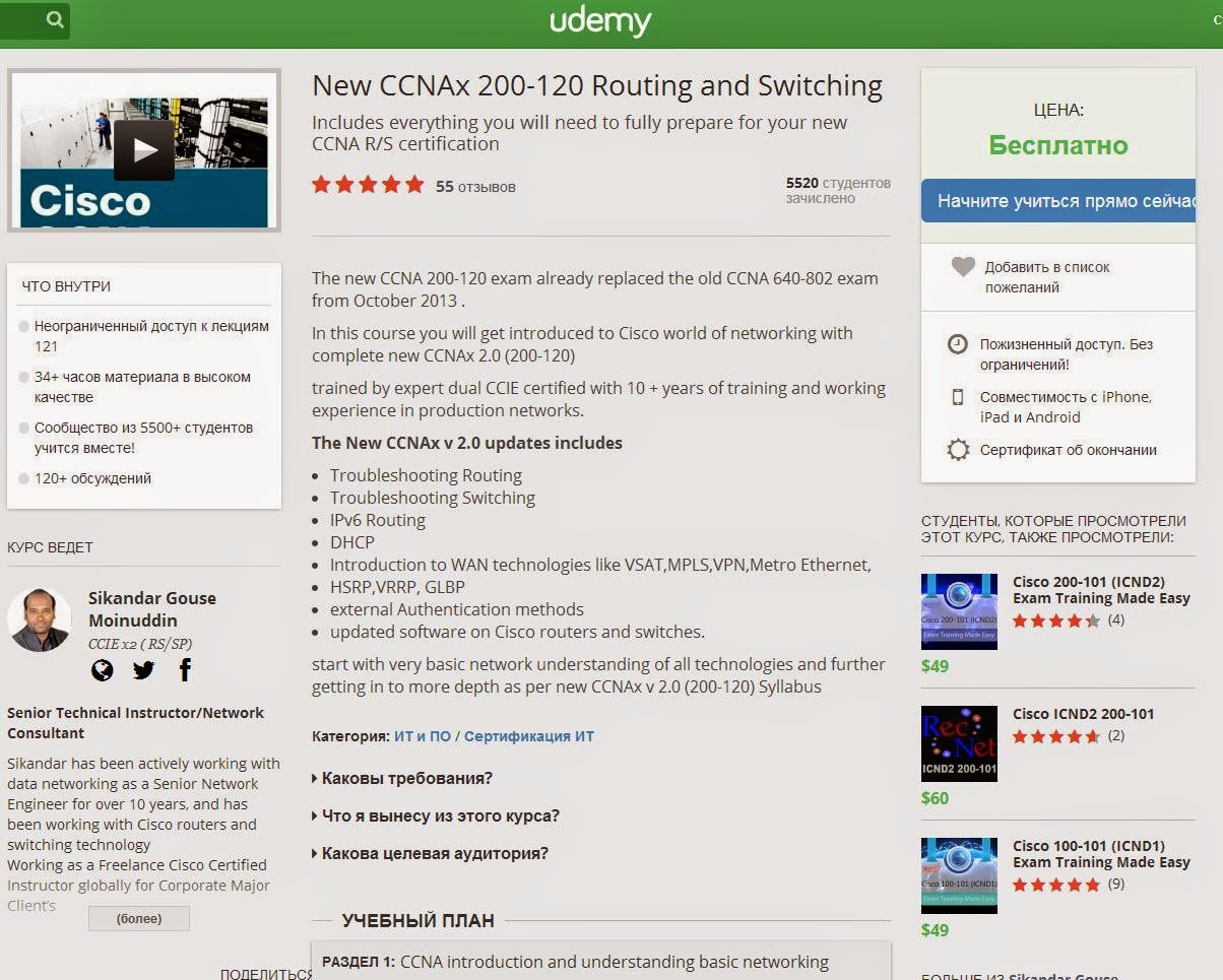 Сегодня совершенно случайно наткнулся на интереснейший бесплатный видео курс по обновленной версии CCNA Routing and Swiching (200-120)