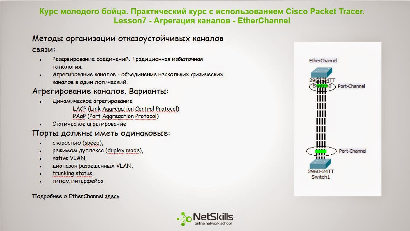 Четверг - очередной видео урок Cisco. В данном уроке мы познакомимся с технологией агрегирования каналов. Рассмотрим протокол EtherChannel. Настроим Port Channel, воспользуемся протоколом LACP.