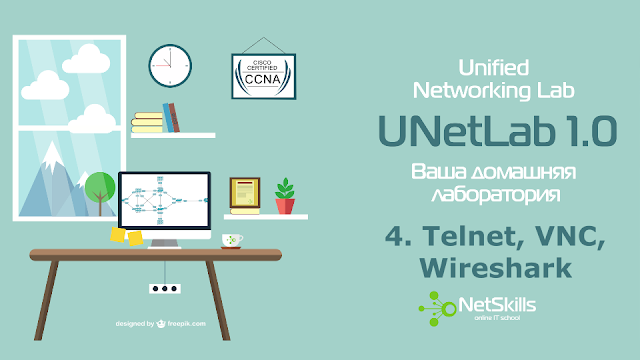 Четвертый урок "Курса UNetLab". На этот раз мы разберемся как подключаться к устройствам по одному клику мышки. Для Telnet мы опробуем встроенный в windows клиент, Putty и SecureCRT. Рассмотрим VNC и настроим интеграцию с Wireshark. Все это делается с помощью Windows integration pack.