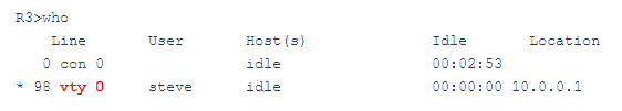 Думаю у большинства читателей возникал вопрос, что это за цифры 0 4? К тому же иногда встречаются 0 15. Что это значит? Эти цифры означают всего лишь возможное количество удаленных подключений. Если мы используем vty 0 4, то создается 5 (0,1,2,3,4) виртуальных линий (консолей), к которым могут подключаться пользователи. Если к устройству одновременно попытаются подключиться 6 человек, то последний (шестой) не сможет этого сделать, т.к. все линии будут уже заняты. Используя команду who можно посмотреть кто подключен к устройству и к какой линии.